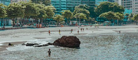 RIO DE JANEIRO, BRAZIL- OCTOBER 14, 2019: A group of Brazilians playing on the shore of Ipanema Beach, with the famous Dois Irmaos mountain behind them