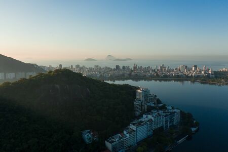 Drone shot of a sunrise over Lagoa in Rio de Janeiro Brazil