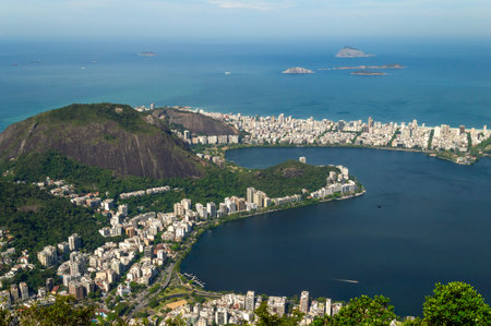 Aerial view of the city of Rodrigo de Freitas lagoon and Leblon in Rio de Janeiro. Amazing and characteristic city detail