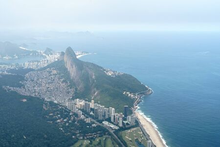 View from the summit of Pedra da Gavea, Rio de Janeiro over Sao Conrado Beach, the favela Rocinha and Dois Irmaos, Two Brothers Mountain. The sea is blue and there is low lying cloud in the sky.