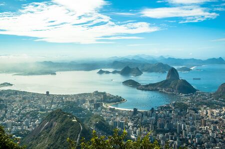 Aerial view of Corcovado, Sugarloaf Mountain and the white buildings and city of Rio de Janeiro on a sunny hazy day. Taken from a lookout in the Tijuca Forest crossing. The city of Niteroi is beyond.