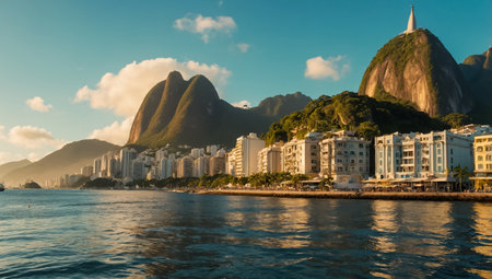 Rio de Janeiro Sunrise Sunset Panorama View of the City Skyline Beaches Beach Coast Sea Mountains Tropical Forest and Blue Cloudy Sky in State of Rio de Janeiro Brazil.