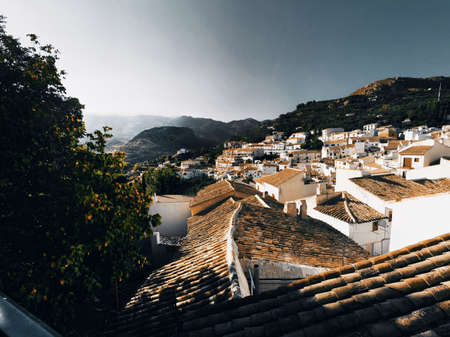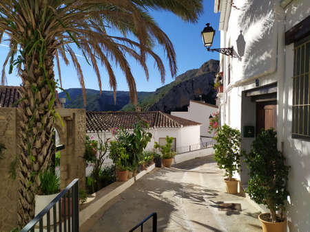 BENIMANTELL, SPAIN - MARCH 27, 2019: Spanish mountains rocky landscape with Benimantell Valencian town, Alicante province, Costa Blanca holiday