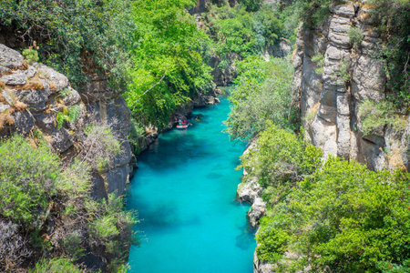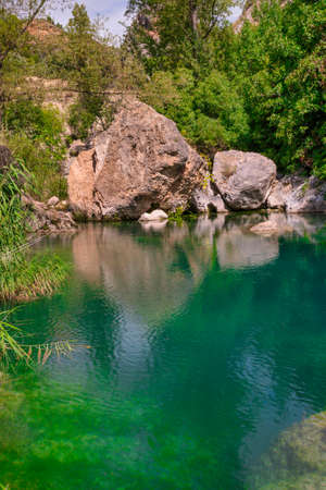 Guadalevin river between rocky slopes with green moss of the canyon or Tajo de Ronda with its turquoise waters, wonderful day in the province of Malaga Spain