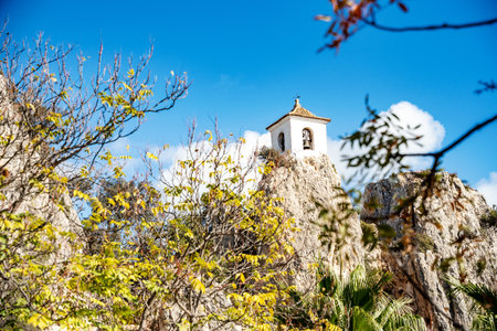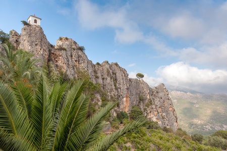 View of the cliffs and the entrance to the town of Guadalest and old bell tower on top of the rock in the province of Alicante, Spain. tourism concept