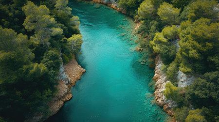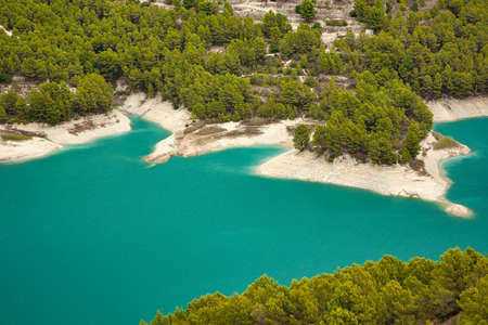 Wooded and limestone shores of the Guadalest lake reserve.Spain. Top view.Horizontal.