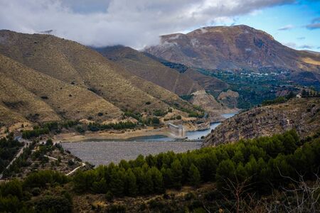 Aerial landscape shot of Reservoir of Chanels in Sierra Nevada mountains Granada, Andalucia, Spain.