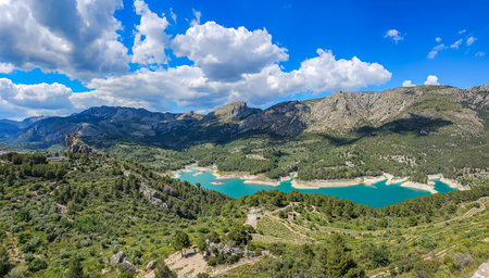 Stunning panoramic view of Guadalest Spain featuring turquoise lake surrounded by lush green forests and towering mountains under clear blue skies. A serene landscape for outdoor enthusiasts.