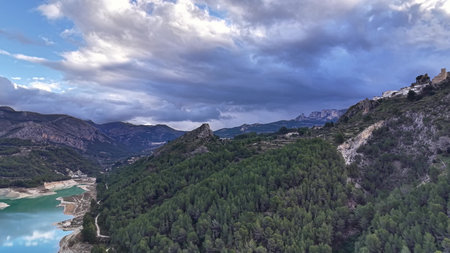 Views of lake and mountains with fog on the peaks. Gran Panoramic photo of the reservoir and city of Guadalest, Alicante, Spain.