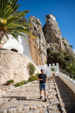 Happy man in sunglasses walking in village of El Castell de Guadalest in Spain