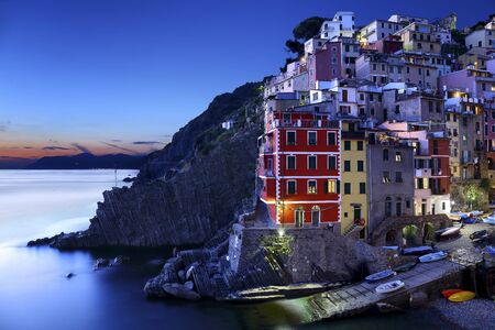 Astonishing evening cityscape of Riomaggiore, first city of the Cique Terre sequence of hill cities . Fantastic sunset in Liguria, Italy, Europe. Great evening seascape of Mediterranean country.
