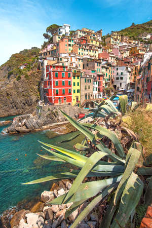 Incredible landscape in Riomaggiore with leaves of agave in Cinque Terre, Liguria, Italy, Europe