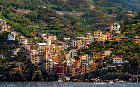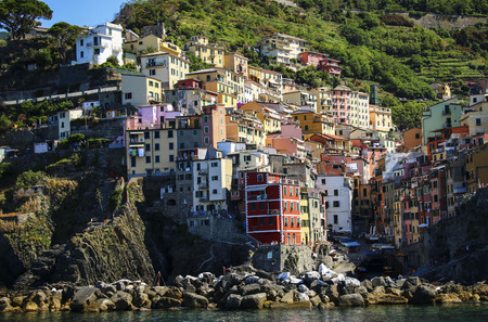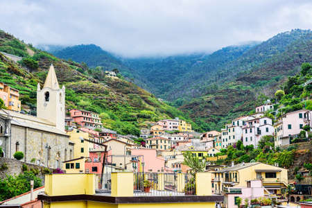 Riomaggiore, Liguria Italy. Traditional typical Italian village in National park Cinque Terre, colorful multicolored buildings houses on mountain