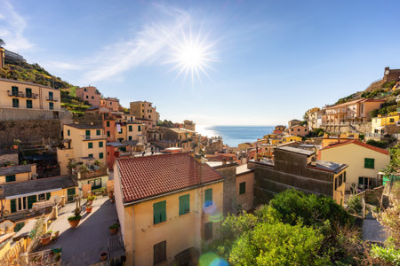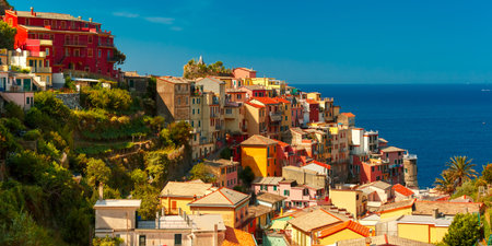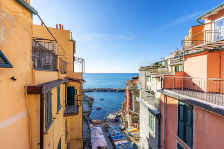 Riomaggiore on the Mediterranean Sea coast in the mountains, an ancient village with colorful houses from the cinque terre, famous tourism destination in Liguria, Italy