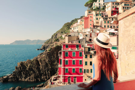 Young stylish woman looking at panoramic view of Riomaggiore colorful village, Cinque Terre, Italy