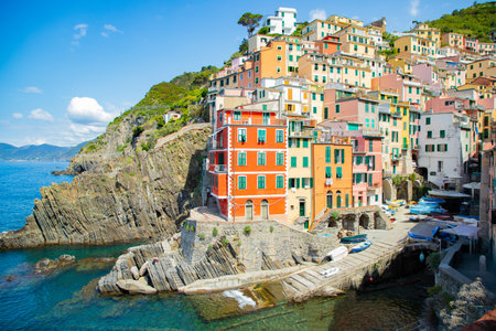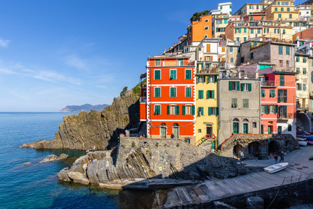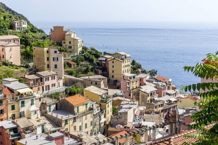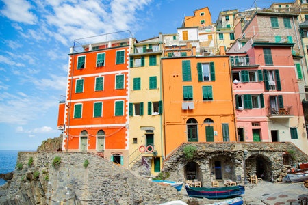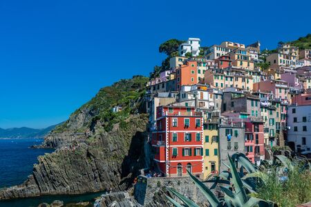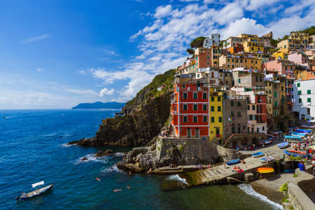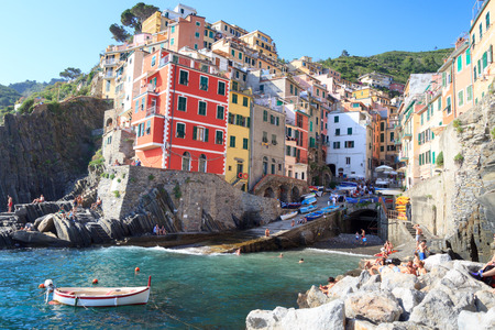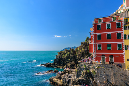 Beautiful summer Riomaggiore - one of five famous villages of Cinque Terre National Park in Liguria, Italy, suspended between Ligurian sea and land on sheer cliffs. People are unrecognizable.