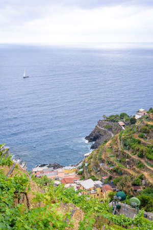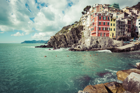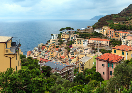 Riomaggiore, Italy - Apr 9, 2016: Landscape view of town and ocean after the rain at Riomaggiore, Cinque Terre, Italy