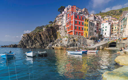 The famous Riomaggiore village with small boats moored in the port, Cinque Terre National Park in Liguria, La Spezia, Italy, Europe.