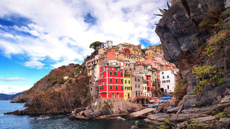 Fisherman village Riomaggiore is one of five famous colorful villages of Cinque Terre in Italy, suspended between sea and land on sheer cliffs