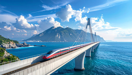 High-speed train on the bridge over the sea in the summer