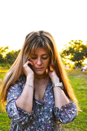 Portait of beautiful young woman at sunset. Young girl enjoys the sunshine in a summer park. Happy woman enjoying nature on sunny field. People, lifestyle, relaxation and vacations concept.
