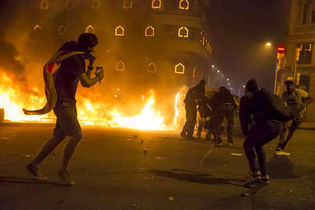 Riots between the Spanish police and the Catalan people in the Urquinaona square of Catalonia, in the context of the first of October.