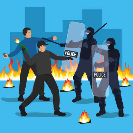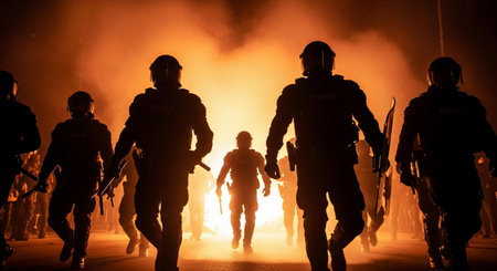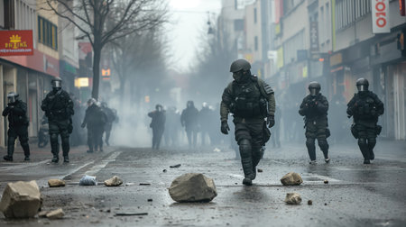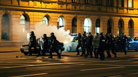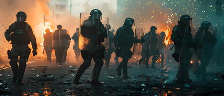 Riot police in gear with shields and batons push back protesters amid chaos and debris. Concept Protest, Riot Police, Civil Unrest, Conflict, Demonstrations