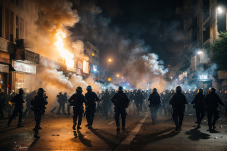In a tense urban atmosphere, police in riot gear advance through thick smoke while facing an uproar during nighttime protests marked by visible flames and chaos.