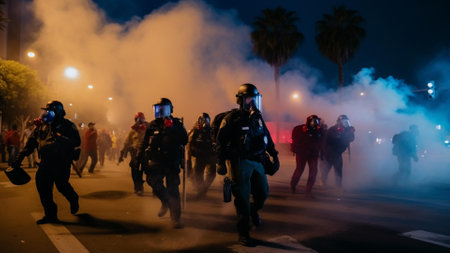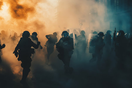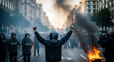 Protesters clash with police amid smoke and chaos, emphasizing conflict and social issues