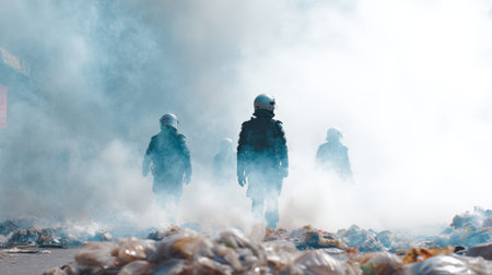 Riot police in full gear are walking through a smoky and debris filled area during a protest, highlighting the tension and aftermath of civil unrest