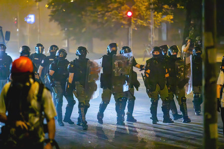 Protesters face off against heavily equipped law enforcement in an urban area as smoke and debris fill the air. Tensions rise amid ongoing public demonstrations for social justice.