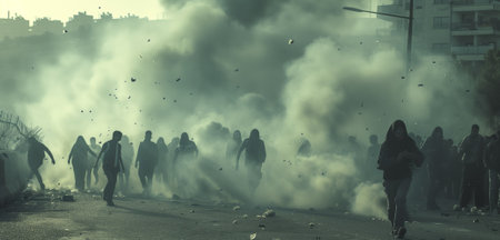 This powerful image captures a group of protesters walking amidst smoke, symbolizing the intensity and impact of their cause. The smoke intoxication adds a sense of urgency and chaos to the scene, reflecting the passion and determination of the demonstrators.