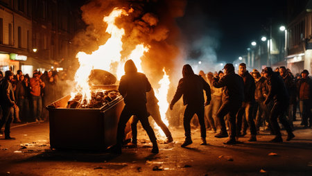 Angry mob burning dumpsters during street riot, generative AI illustration