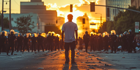 A young man stands in front of police during a sunset protest, symbolizing resistance