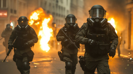 Police officers in riot gear stand ready for crowd control operation. Concept Law enforcement, Riot gear, Crowd control, Police officers, Public safety