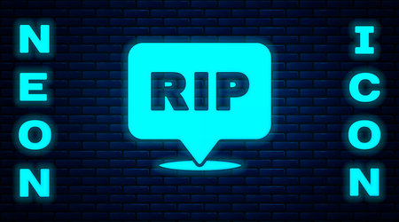 Glowing neon Speech bubble rip death icon isolated on brick wall background. Vector.