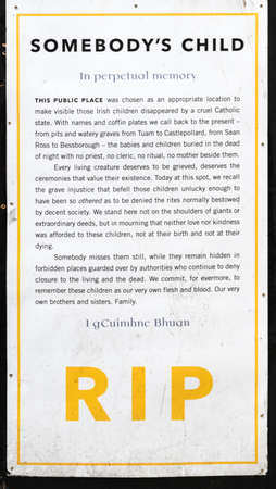 Dublin, Ireland - August 7, 2017: Explanation on memorial display of names and date of murdered children on Corner of Essex Street West and Exchange Street Lower.