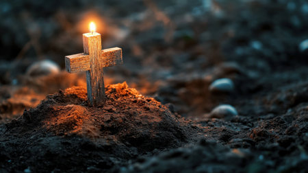 A wooden cross with a lit candle stands on a mound of dirt, possibly symbolizing remembrance, faith, or loss in a somber, perhaps graveyard setting.
