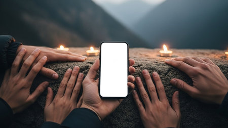 Mockup image of hands holding mobile phone with blank screen over mountain background