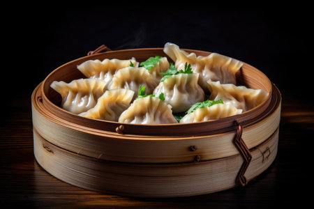 A bamboo steamer filled with steaming dumplings sits invitingly on a dining table, complemented by sauces and a warm ambiance, reflecting culinary artistry.