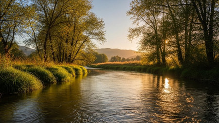 AI Generated. A peaceful view of a river winding through a meadow