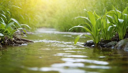 Serene stream flows through a lush green landscape