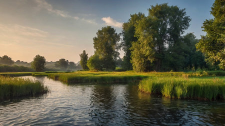 A peaceful river flows smoothly through lush greenery, reflecting trees and sky in its calm waters. This serene landscape embodies the beauty of nature in a tranquil setting.
