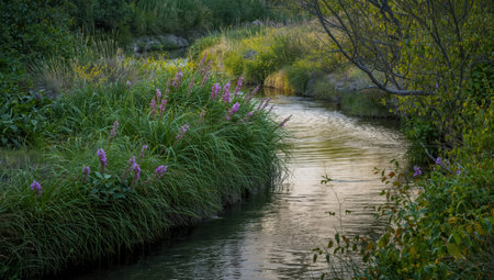 Wildflower riverbank with pink flowers and soft golden reflections