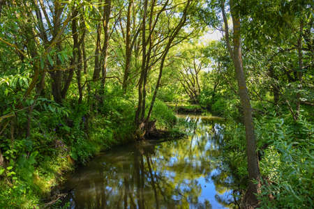 Landscape with a small river in the forest at sunset. Beautiful natural background.