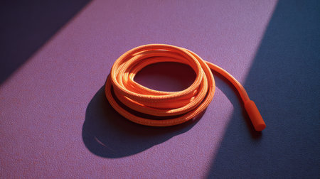 A vibrant orange rope elegantly placed on a colorful surface, highlighting the interplay of shadow and light in a modern, artistic composition suitable for creative uses.