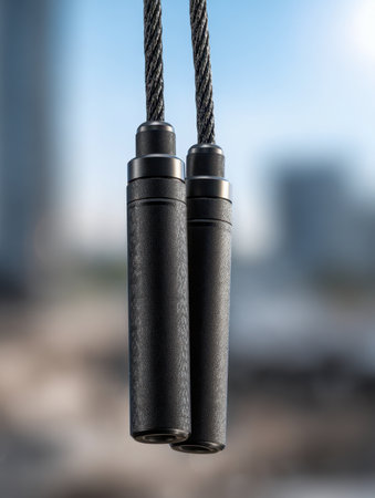 Outdoor workout gear showcases a black jump rope with intricately braided cord, suspended against a softly blurred city skyline, inviting active urban lifestyles.