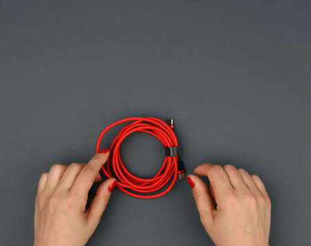 female hand holds twisted cable for charging mobile devices in a red textile wrapper on a black background, close up