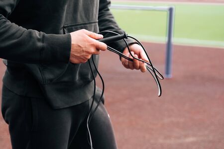 A man holds a rope for sport. The concept of a krgossfit on a fresh rein