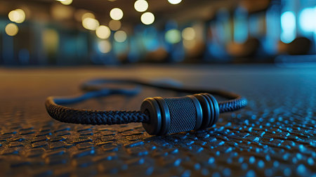 A close-up of a high-performance skipping rope with adjustable handles placed on a gym floor